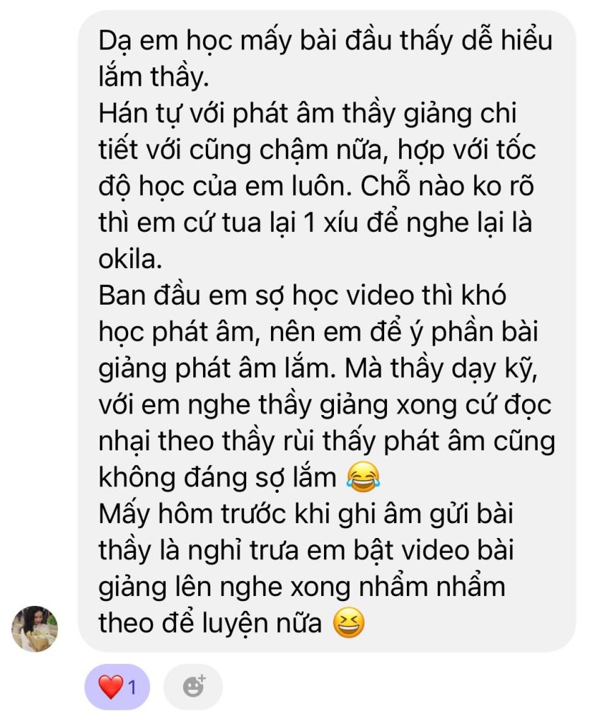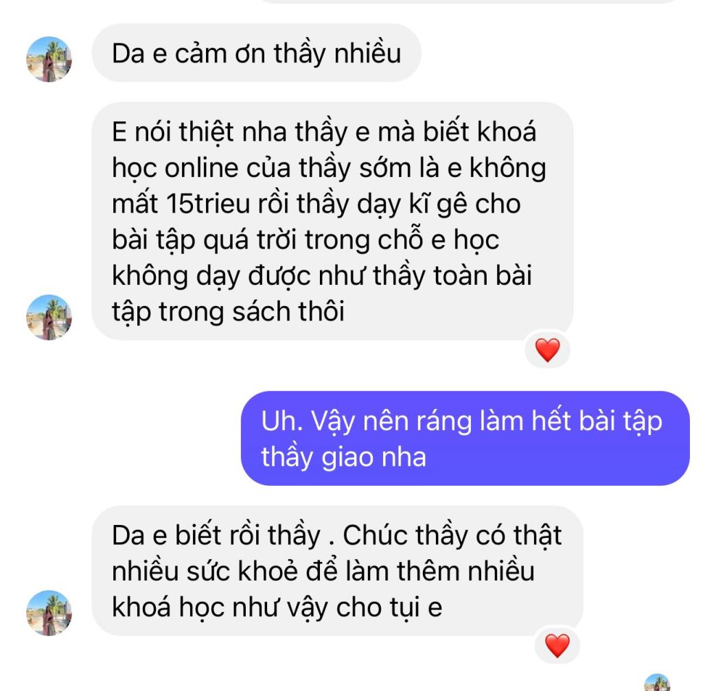 • Bài tập ôn tập sau mỗi bài học: Để củng cố kiến thức, bạn sẽ nhận được các bài tập đi kèm mỗi bài giảng nhằm ôn tập từ vựng và luyện tập cấu trúc câu. Đặc biệt, bạn sẽ được sửa bài qua nhóm và Messenger để đảm bảo tiến bộ liên tục.