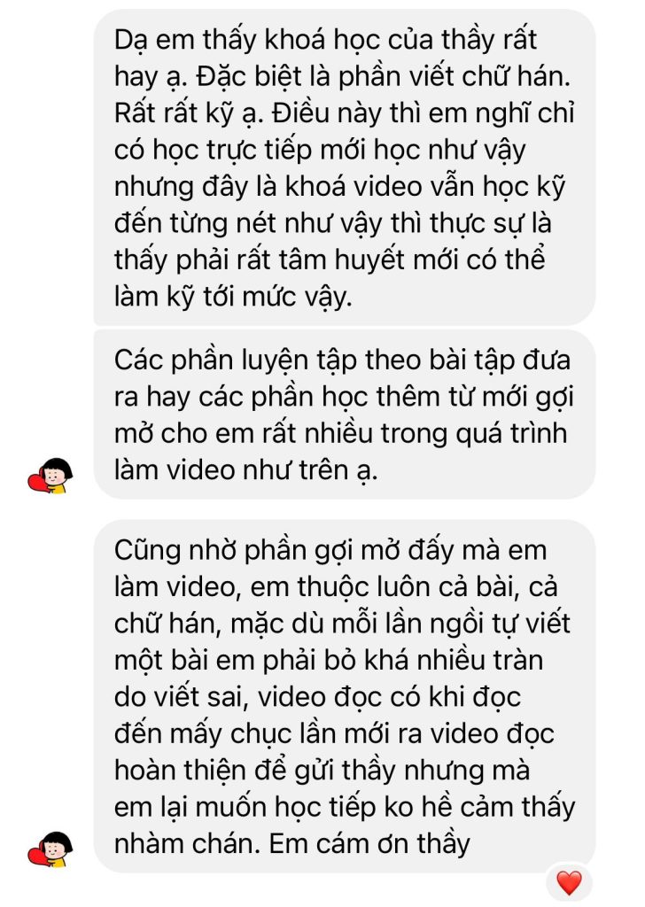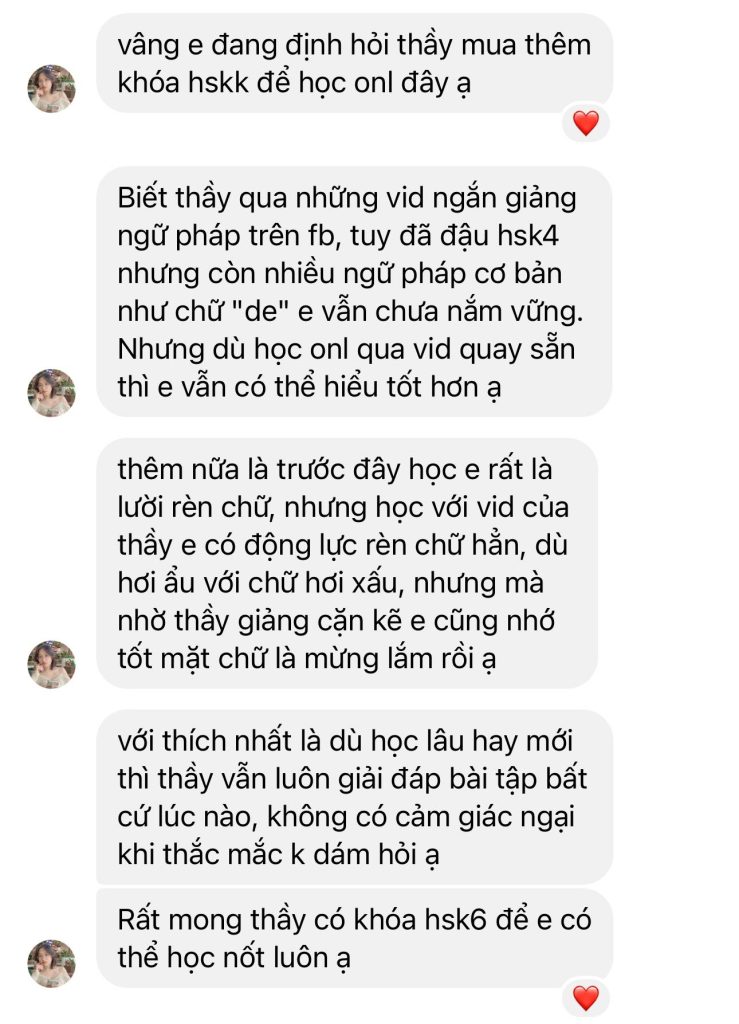 • Uy tín và hiệu quả: Khoá học đã được phát hành từ năm 2018, thu hút gần 5000 học viên đã và đang theo học, tạo nên một cộng đồng học tiếng Trung năng động và chất lượng. Hãy bắt đầu hành trình chinh phục tiếng Trung của bạn ngay hôm nay!